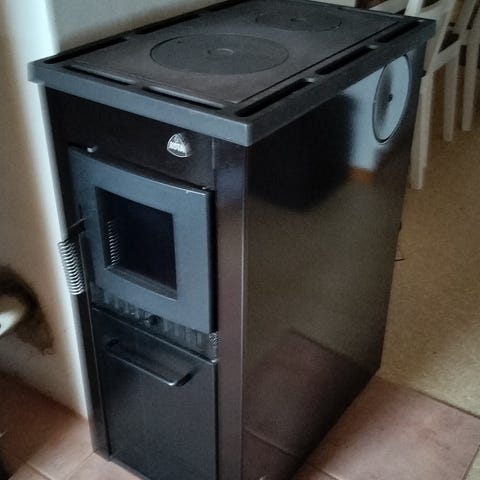 Puupeli kamiina. Tummanruskean värinen. Tulipesään menee normi 33cm klapit. Kannen alle laitetaan kiuaskiviä, eli tämä varaa vähän lämpöä. Keittolevy päällä, varmaan tällä voisi pannukaffetkin keitellä. Vähän käytetty, lähes uuden veroinen. Oiva lämmityslaite esim. mökille tai talliin. Hormilähdön kulmaa voi vähän säädellä.