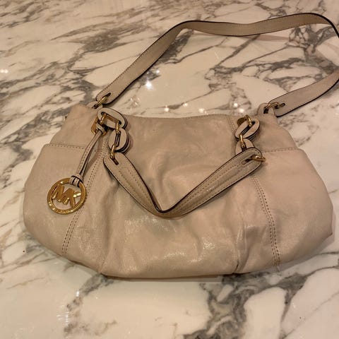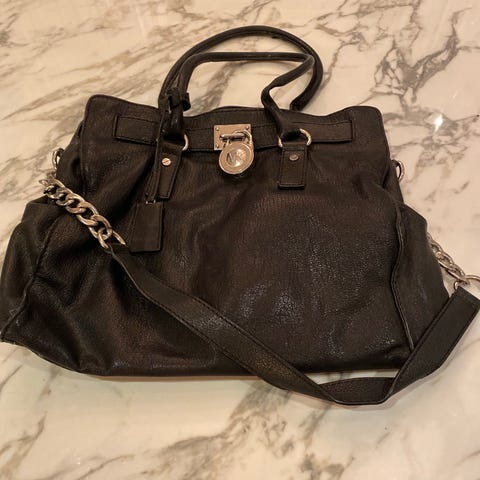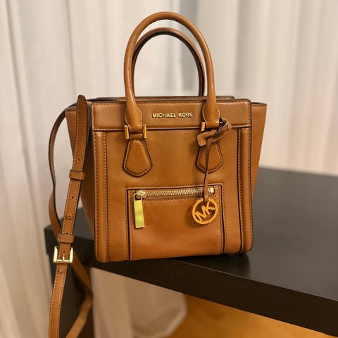 Vintage 2000-luvun alkupuolen Michael Kors nahkainen naisten laukku ruskeassa värissä. Laukku on valmistettu nahasta ja siinä on sisäpuolella useita taskuja. Laukussa on koristeena Michael Korsin logo ja tupsu. Pinnassa haaleita naarmuja mutta laukku muuten hyvässä kunnossa.