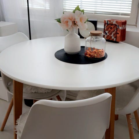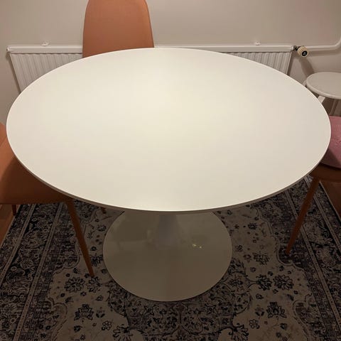 Pyöreä valkoinen ruokapöytä. Ihan ok kuntoinen muuten, mutta pieniä kulumisen jälkiä jalkaosassa. Pöydän pinnassa myös vähän tummentumaa. En tiedä lähteekö pois, en ole yrittänyt poistaa. Voi päällystää vaikka DC - fixillä tai sitten maalata tai peittää tabletilla. Kuitenkin tukeva. Kansiosa on nyt irroitettu valmiiksi kuljetusta varten