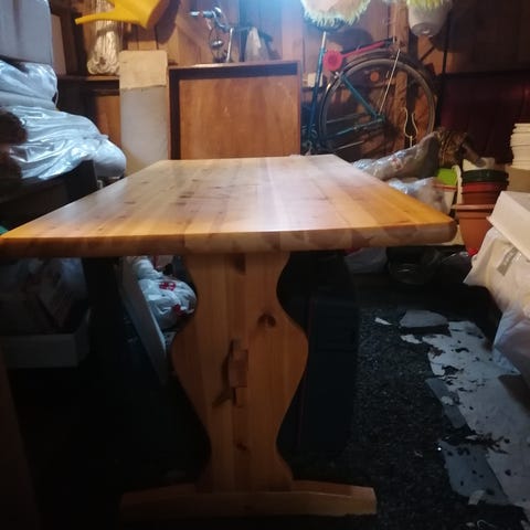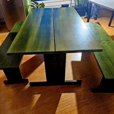 Käytön jälkiä löytyy. Penkkien koko 150x31x43. Pöytä 150x70x70
