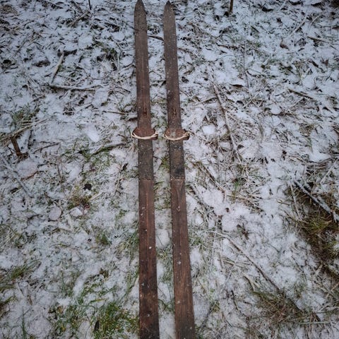 Porvoon Lampisen tehtaan "Lampinen Lamelli 5 Kilpa" puusukset, Voitto-siteet, kunto hyvä, pituus 190 cm