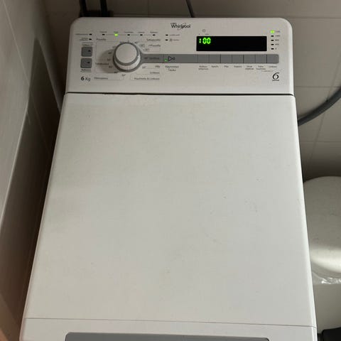 Whirlpool päältä täytettävä pesukone valkoisella värillä. Pesukoneessa on useita pesuohjelmia ja säätimet sijaitsevat laitteen yläosassa. Sopii pyykinpesuun kotitalouksissa. Ostettu 2025 lahjana verkkokaupasta.