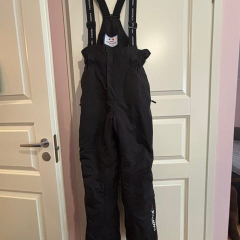 Toppahousut kokoo miesten 52, vastaa L kokoo. Kuminauhamaiset säädettävät henkselit, korkea vyötärö, jossa pitkä vetoketju ja lumisuoja. Punteissa lumisuojat ja jalkalenkeille paikat, niitä ei löydy mukaan. Lahkeissa puoleen sääreen aukeava vetoketju.