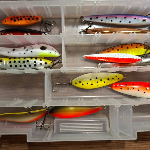 Saariselällä inarin uistelian valmistamia taimenlusikoita 25kpl ja yksi tiura. Vain koko setti kaupan. Ja myös rasiat