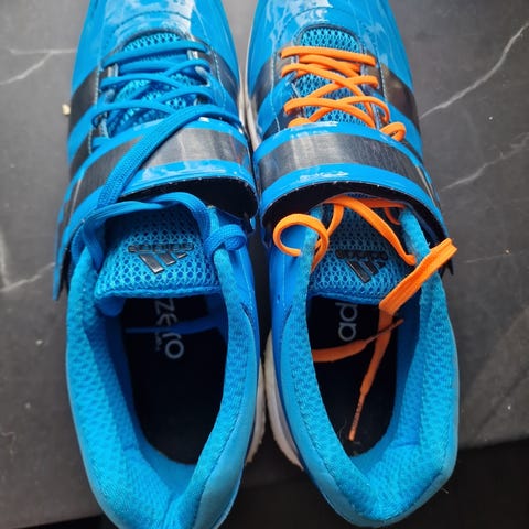 Tässä aivan loistava keihäspiikkarit. Kyseessä on adidaksen adizero merkkiset piikkarit. Piikkareilla on heitetty kaksissa kisoissa, joten kengät ovat kuin uudet. Kuitenkin yksi huomio kengän koosta! Kyseessä on 47 1/3, mutta ne sopivat oikeasti 46-46.5 kokoisille jaloille! Piikit ovat kaikki tallella ja terävät. Mukaan tulee myös piikille oma kiristys työkalu.