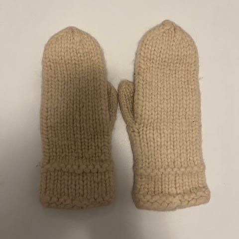 Harmaat neulotut lapaset punaisilla tupsuilla.
