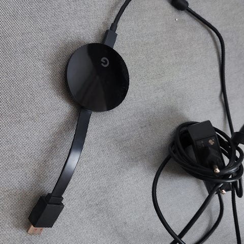 Google Chromecast mediatoistin. Laite mahdollistaa suoratoistopalveluiden, kuten YouTube, Netflix ja HBO, käytön televisiossa. Mukana virtalähde ja HDMI-liitäntä. Väri musta.