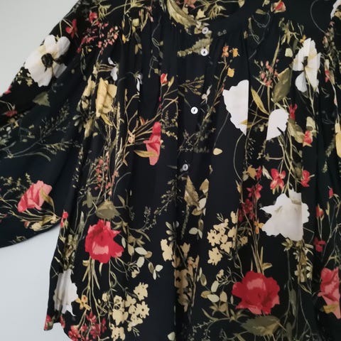Kukkakuvioinen beigesävyinen paitapusero. Pituus 70 cm. Ympärysmitta 120 cm. Hiha kainalon alta 47 cm. Kaunis pyöreäkaulus. Hinta 2 euroa