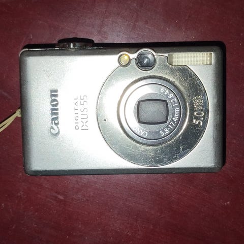 Canon digitaalikamera. Kuvassa kamera ja laturi. Kamera on pienikokoinen ja sopii esimerkiksi arkikäyttöön tai matkakäyttöön.