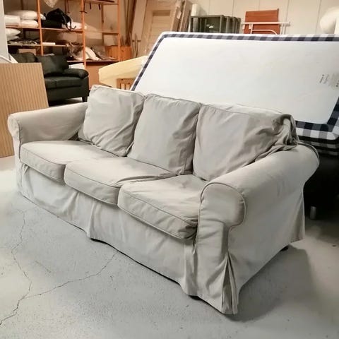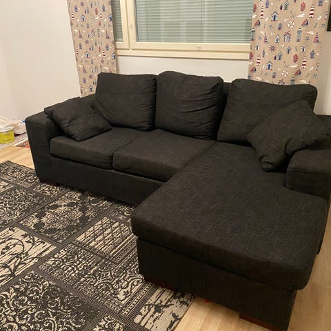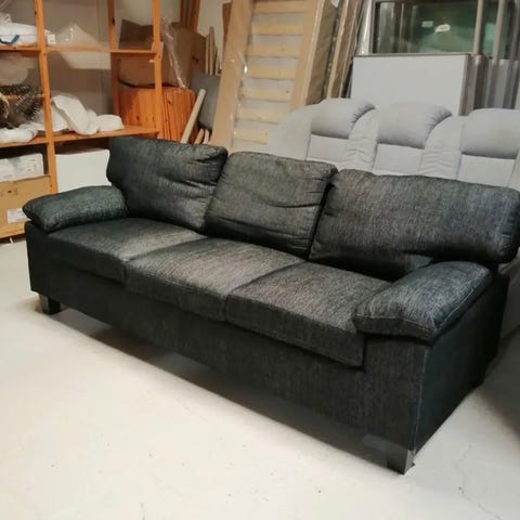 Hyväkuntoinen, siisti käytetty 3 istuttava sohva harmaalla kangasverhoillulla.
