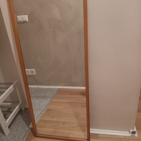 Myynnissä kuvan peili. Noin 107 cm korkea ja 37 cm leveä. Haku Nummelta.
