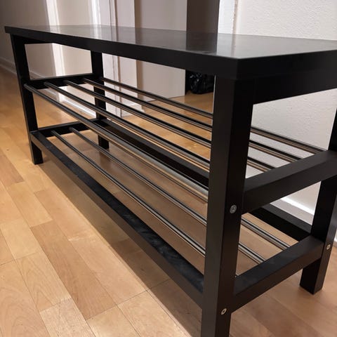 Hyväkuntoinen käytetty penkki / kenkähylly on kätevä kaluste eteiseen. Pehmustetulla istuimella on mukava pukea kengät ja sen alapuolella on säilytystilaa kauden käytetyimmille kengille.