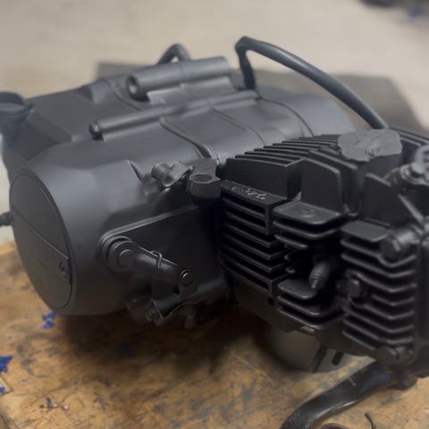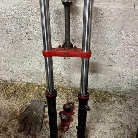 Drac SM 125 pyörästä otettu USD keula. Pulverimaalatut t-palat sinisellä. Muualta laitettu carbon teippiä. Teipin alla on kultainen pohja. Ei vuoda kumpikaan pumppu. Jarrusatula samasta pyörästä on jossain ja voin katsoa löytyykö. Myös jarrulevy.
