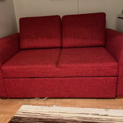 Myydään sohva, josta saa 100 cm leveän ja 180 cm pitkän vuoteen sekä 2 nojatuolia.