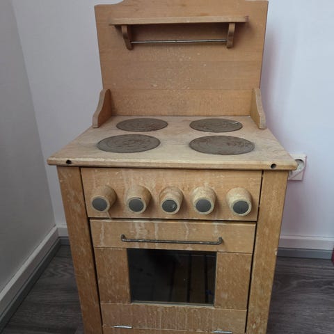 Annetaan kovia kokenut leikkihella, todistetusti toimii silti leikeissä. Kahva irronnut, mutta oven saa silti auki helposti (ks vika kuva).