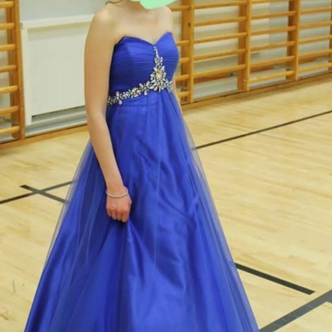 Kerran käytetty tummansininen vanhojentanssimekko.