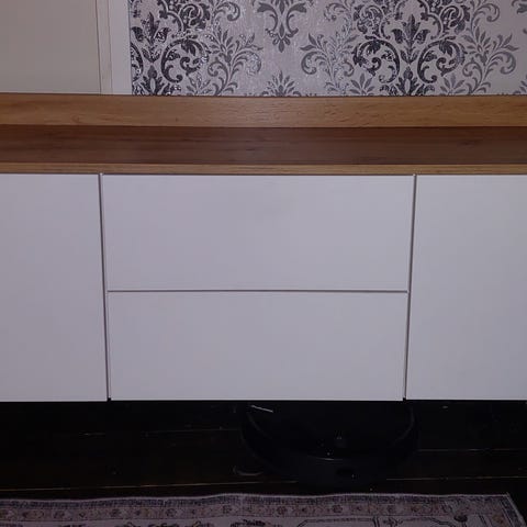 Sotkan liukuovisenkki, 4 lokeroa, vaaleanharmaa betonikuviointi, 2 liukuovea kiiltävä valkoinen, jalat harmaa (ei alkuperäiset). 2 lokeroa on jaettu välilevyillä ja niihin mahtuu 148 cd/dvd-levyä. Naarmuton, hyvin koottu. Vain nouto Oulun Kirkkokankaalta (1. krs).