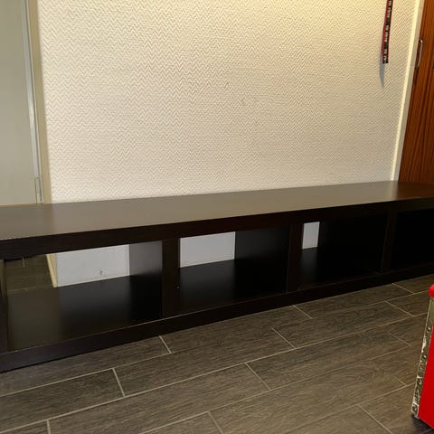 Annetaan kuvan TV taso (alunperin kai ikeasta). Vain toinen ovi tallella, mutta näyttänyt kivalta näinkin. Toisen kaapin taakse tehty reikä johdoille