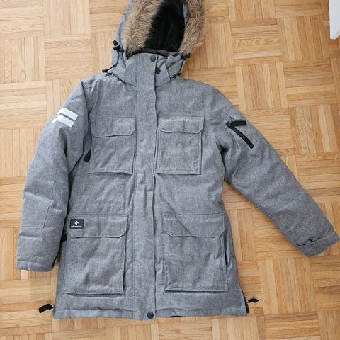 Myydään harmaa Pola S-kokoinen toppatakki. Revennyt sauma on ommeltu kainalon kohdalta. (Kuva 2)