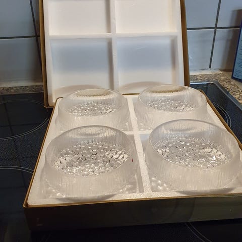 Jälkiruokakulhot ovat uutta tuotantoa ja ilman punaista i-merkkiä. Käyttämättömät ostolaatikossaan. Leveys 115 mm, korkeus 50 mm.