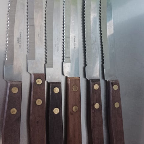 Uudet käyttämättömät pihviveitset puulaatikossa.