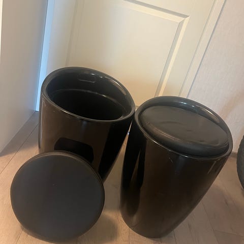 Musta muovinen säilytysjakkara eteiseen, olohuoneeseen tai vaikka kylpyhuoneeseen pyykkijakkaraksi, jonka päällä voi istuskella ja katsella pesukoneessa pyöriviä pyykkejä. Saman tyylinen, kuin Wenko- ,Idimex- , Gisele- ja Tumba-merkkiset vastaavat tuotteet.