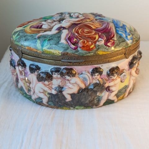 Italialaista käsityötä oleva posliinirasia jossa on irrotettava kansi. Kermanvalkoinen väriltään ja koristeessa on kultainen reuna. Sopii säilytykseen ja koristekäyttöön. Kannen sisäpuolella pieni halkeama josta kuva ilmoituksessa. Muuten kunto hyvä ja tavara erittäin uniikki yksilö. Hinta sovittavissa