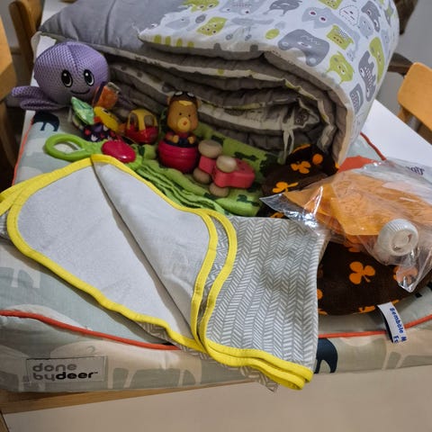 Reunapehmuste, Mobile (ovh 59€) viltti, Familon makuupussi, Familon pinnasängyn petari, pussukka taskuilla (pinnasängyn reunaan sidottava), niskatyyny, pehmoleluja, puinen lelu