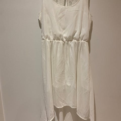 Kaunis valkoinen mekko. Kevyttä kangasta joka ei hirveästi jousta (hieman läpikuultava). Mekossa ei kokoa, mutta vastaa S-kokoa. Joitakin käytön jälkiä rinnuksessa, kainalossa ja mekon sisäpuolella (näkyy kuvissa). Saattaa lähteä pois pesemällä. Muuten hyvässä kunnossa.