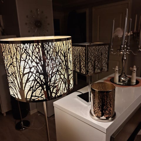 Aivan ihanat METSÄ -Aiheiset jalkalamppu, pöytälamppu sekä PartyLite-kynttiläsomiste myyntiin settinä 😍🫶