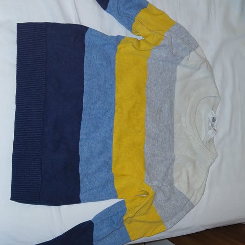 Hyväkuntoinen lasten siniraidallinen neule. Koko: 104.