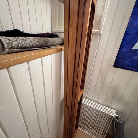 Itse valkoiseksi maalattu hylly,on vanha. Todella tukeva ja jämäkkä.