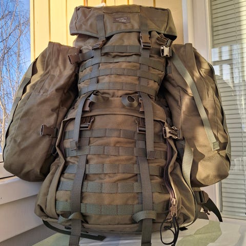 Noin 3 vuotta käytössä ollut rinkka. Käytetty kertausharjoituksissa, MPK:n kursseilla ja vaelluksilla. Vetoketjut, soljet ja hihnat ovat ehjiä. Kaikin puolin siistissä kunnossa.