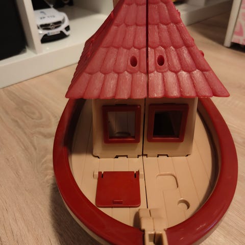 Muumilaiva. Lelussa on pyörät ja se aukeaa sisältä, sisältäen pieniä huonekaluja ja yksityiskohtia. Mukana on useita Muumi-hahmoja