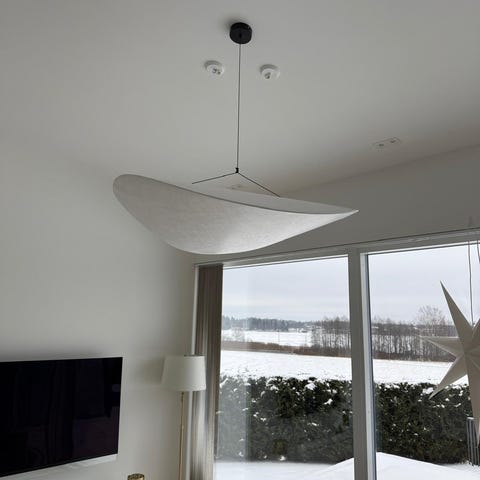 Japandi tyylinen kattovalaisin. Käsintehty, Uniikki valkoinen varjostin paperimassasta. Musta,kierretty kangas johto ja kattokuppi.