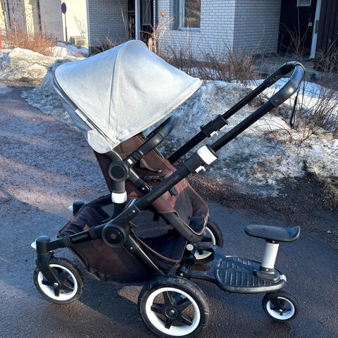 Mukana vaunukoppa ja seisomalauta. adapteri on helppo kiinnittää seisomalaudan rattaisiin.