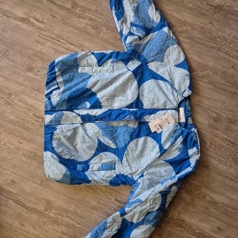 Ihana Marimekon kevyesti topattu takki vaalealla unikko kuosilla. Hihassa pieni tumma jälki, en ole yrittänyt poistaa. Vastaa kokoaan tai reilu M.