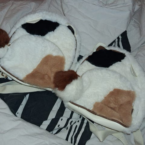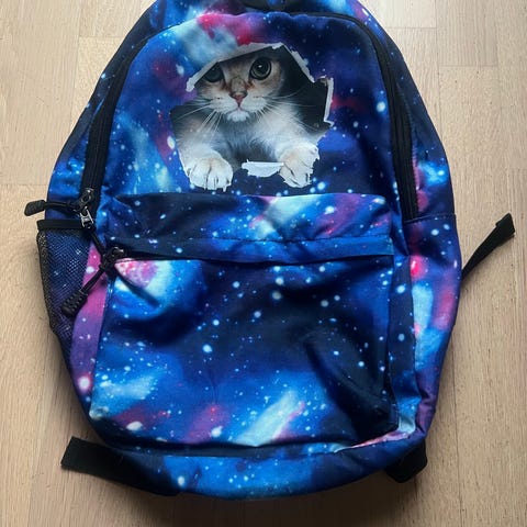 Valkoinen ja pastellinvärinen söpö Pusheen the Cat "I'm busy" kissa reppu. Repun korkeus noin 43cm. Joitakin käytönjälkiä löytyy (katso kuvat) mutta pääosin todella siisti :) Repussa useita taskuja. Kerran käytetty.