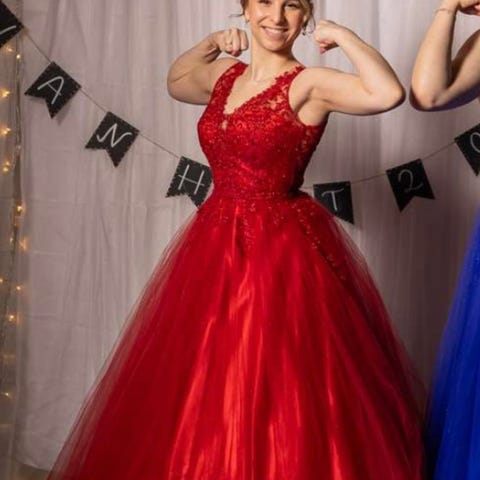 Upea juhlamekko/ iktapuku. Yläosassa paljetteja alaosa kerrostettu tylli.