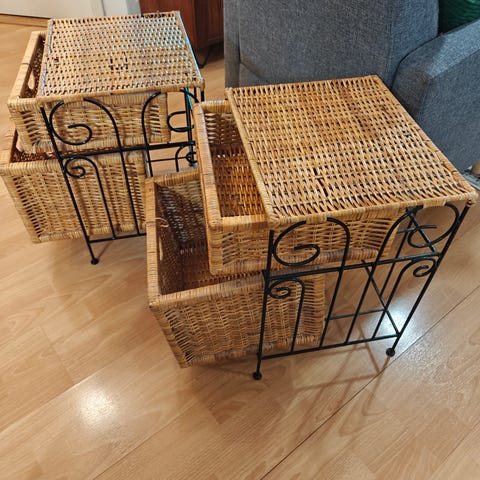 Hakusanat: säilytys, käytetyt huonekalut, sisustus, musta pöytä, tarjoilu, punottu laatikko, sivupöytä, apupöytä, vetolaatikko, rottinki, rottinkinen, taso, huonekalu, huonekalut, sivupöydät, retro pöytä, puinen, puu paju köynnös, pöytä, vintage boho, pöydät, moderni retro