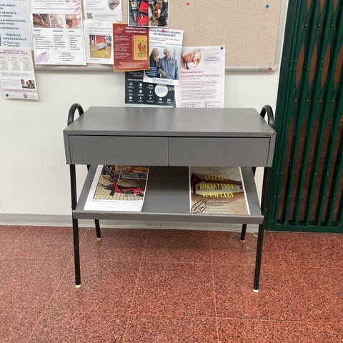 Musta sivupöytä, jossa on kaksi tasoa ja alhaalla rottinkipaneelinen vetolaatikko. Lisäksi rottinkinen pulloteline. Pöydän pinta on kulunut ja siinä on naarmuja sekä kulumajälkiä reunoissa. Laatikon etuosa on punottu, mikä tuo siihen hieman tekstuuria ja kontrastia.