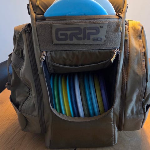 Myyntiin vähällä käytöllä oleva fribabägi. Itellä ollut n 8 kiekkoa siellä. Veikkaisin et 10-12 kiekkoa mahtuu. Molemmilla sivuilla vetoketju lokero ja pullopidike,putteritasku ja päällä myös yksi pieni vetoketjullinen lokero sekä isoin osio mihin kiekot mahtuu.