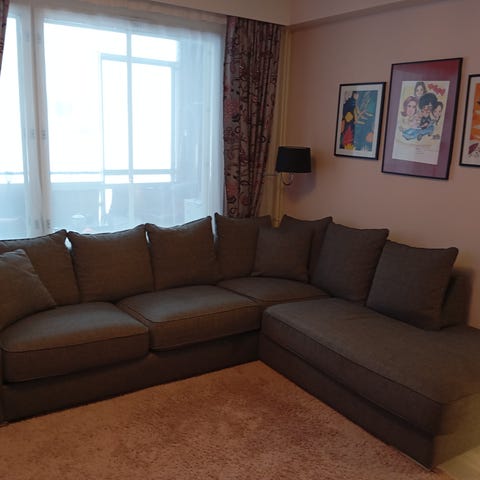 Käytönjälkiä kulmissa (kuvissa). Muuten on hyvässä kunnossa. Myydään, koska sohva ei mahdu tulevaan asuntoon.