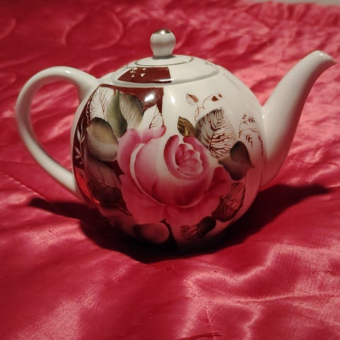 Neuvostoliitossa valmistettu käyttämätön Lomonosovin kukkoaiheinen teekannu. Kannun tilavuus 0,6 litraa.