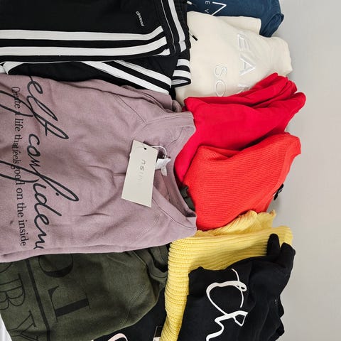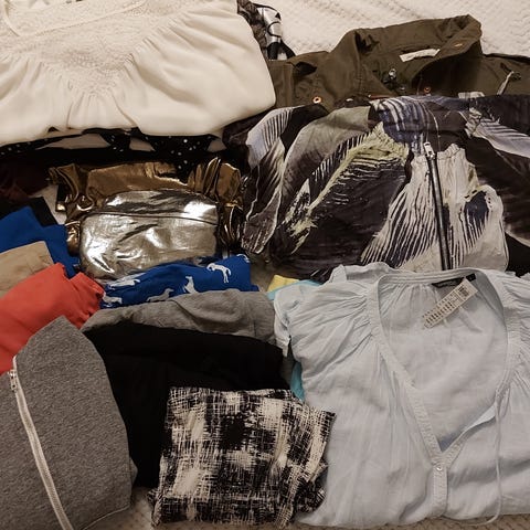 Myydään kuvanmukainen vaatepaketti koko L. Suurin osa käyttämättömiä.