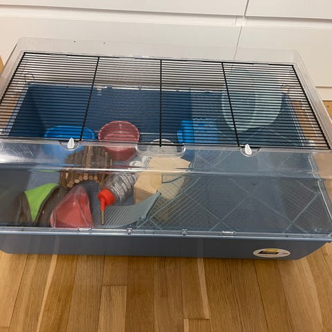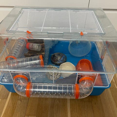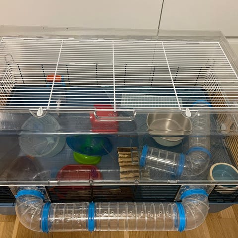 Hamsterin häkki tarvikkeineen. Häkin mitat 41x66x41. Siisti kunto, jotka näkyy kuvassa. Kaikki kuvassa olevat tarvikkeet kuuluvat kauppaan, sis.mm., juoksupyörä, jne.