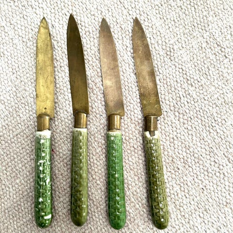 4 kpl Uchatius Bronce veitset 1900-luvun alusta, kauniisti patinoituneet. Käyttökelpoiset.
