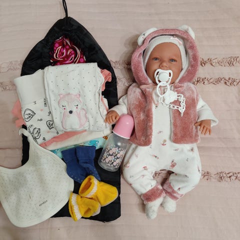 Llorens reborn-nukke ja tarvikkeet. Nuken pituus n. 45cm. Nukke on hyvässä kunnossa ja sillä on mukana alkuperäiset tarvikkeet, lisäksi muutamia vauvanvaatteita.