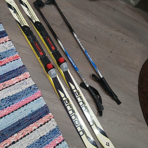 Myydään 140 cm pitopohjasukset ja 100 cm sauvat. Sukset nnn-siteillä, normaalia kulumaa pohjissa.