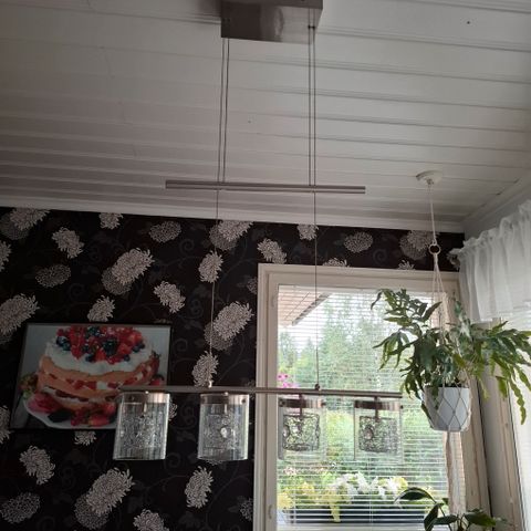 Kattovalasin neljällä polttimolla, maitolasiset kuvut 17 cm. Messinkinen runko, korkeus säädettävissä 91…110 cm. E14 kannat.